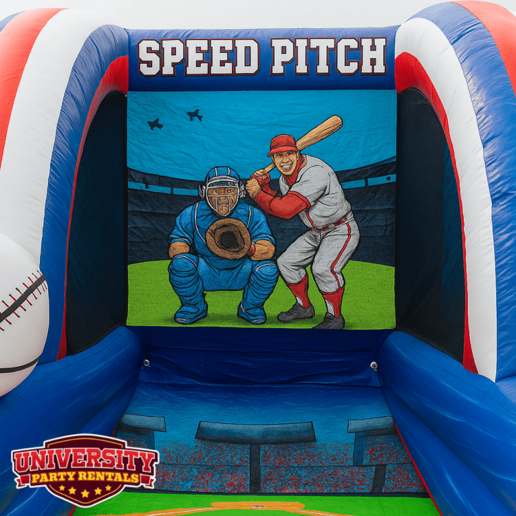 The Triple Threat is the ultimate all-in-one sports inflatable, combining three fan favorites into one action-packed unit. Step up and choose your challenge: test your arm in the quarterback blitz, show off your accuracy in the soccer shootout, or bring the heat in the baseball pitching duel. It’s a versatile and space-saving attraction that offers something for every athlete.
